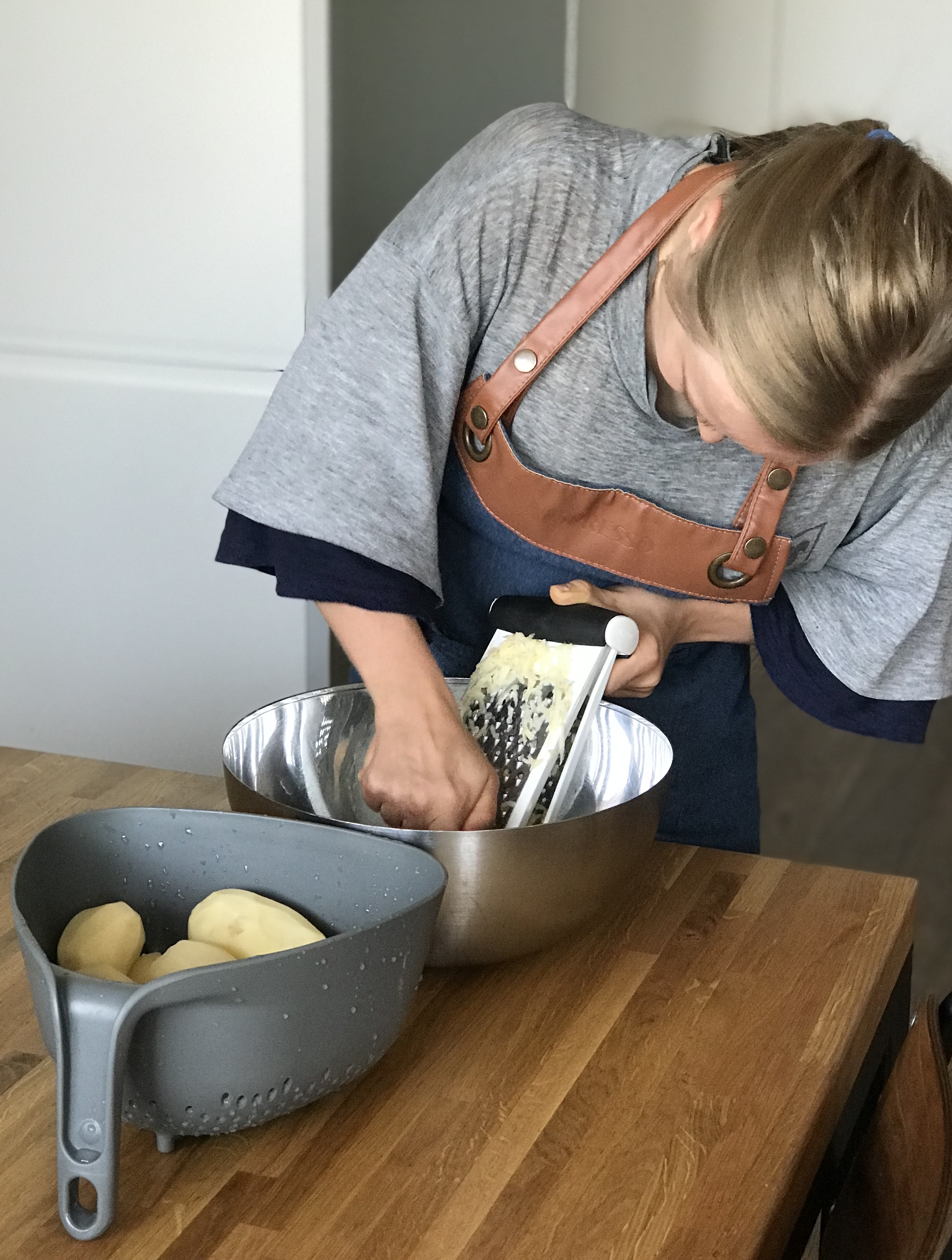 Utarte odstawić, przykryć czymś ciężkim, aby zebrała się woda. Odlać. Można też wrzucić obrane ziemniaki do jakiejś ściereczki i mocno, bardzo mocno odcisnąć wodę.