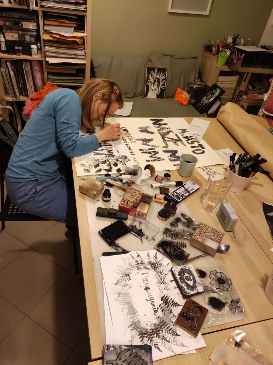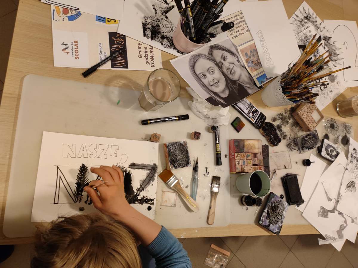 Pędzle, tusze, kleje, flamastry, farby, stemple, kawa, herbata, muzyka w tle i praca wre.