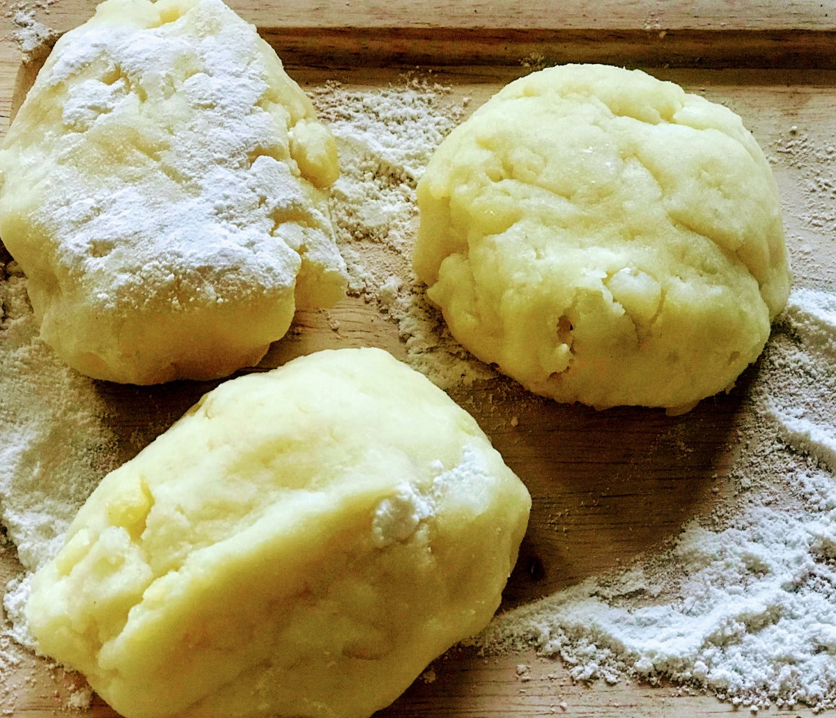 Do ziemniaków dodać mąki, około 1/4 ilości ziemniaków. Około, bo najlepiej smakują, gdy powstają w wersji “na oko”. A to już często jest kwestia umowna, tyle aby można było ulepić kulkę.