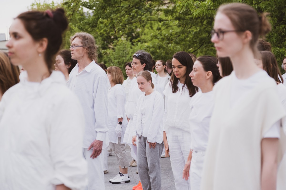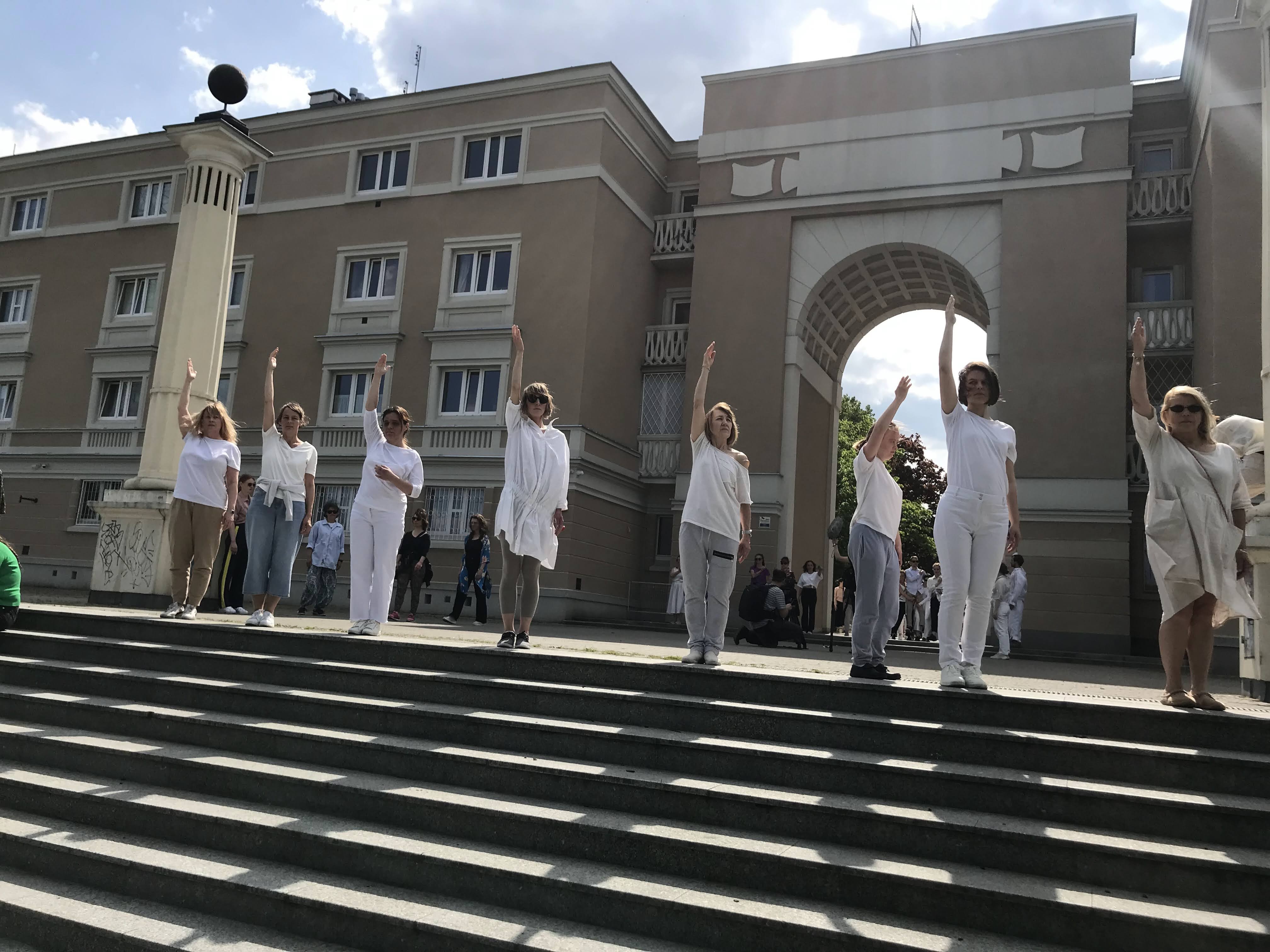 Razem z grupą liczącą prawie 70 osób, przemierzaliśmy trasę od pomnika Bohaterów Getta do kina Muranów, tworząc żywe pomniki za pomocą naszego ciała, gestów i ruchu. Stanowiły one wyraz naszej troski, współuczestnictwa i potrzeby zachowania pamięci o dawnych wydarzeniach.